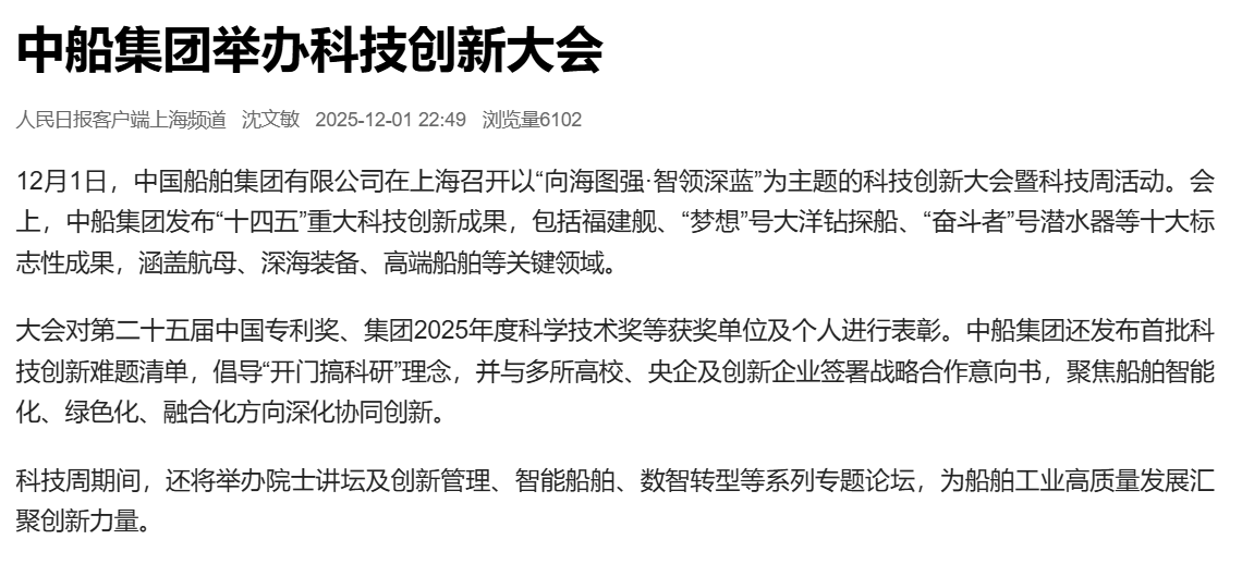 12月1-5日,中國船舶集團有限公司在上海舉辦了科技創新大會暨科技周活動。