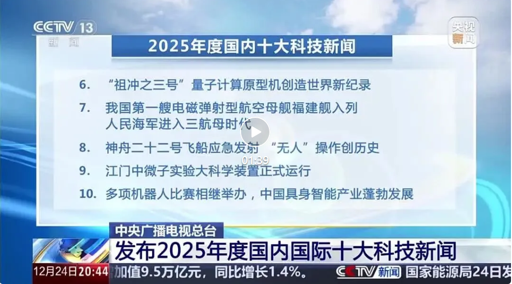 12月24日,中央廣播電視總臺發布2025年度國內十大科技新聞,我國第一艘電磁彈射型航空母艦福建艦入列人民海軍進入三航母時代位列其中。